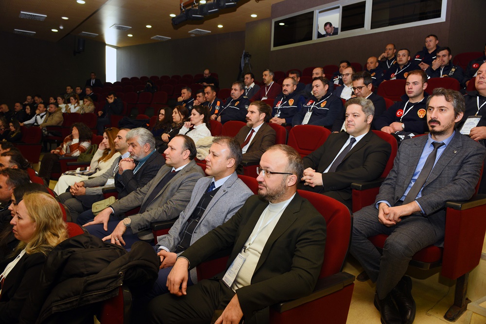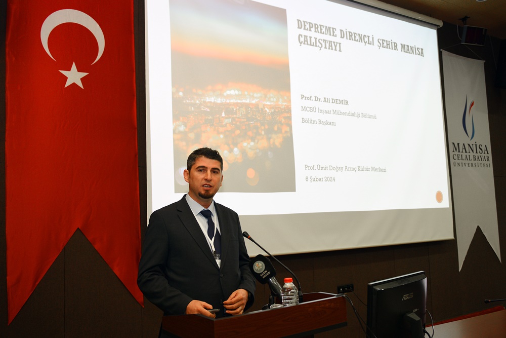 Following Mayor Cengiz Ergün's speech, Prof. Dr. Orhan Dede Polat from Dokuz Eylül University Faculty of Engineering Department of Geophysics Engineering presented "The Importance of Geophysical and Seismological Research," and Prof. Dr. Ali Demir, Head of the Department of Civil Engineering at Manisa Celal Bayar University Faculty of Engineering, presented a presentation on the city's building stock.