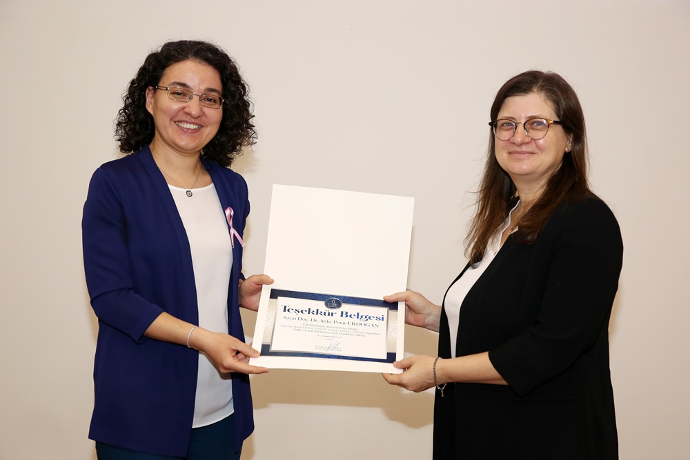 MCBÜ Sağlık Hizmetleri Meslek Yüksekokulu Öğr. Gör. Pınar Arpacı’nın ‘Gerçek Bir Kanser Öyküsü’nü paylaştığı panelde, Bornova Anadolu Lisesi Türk Dili ve Edebiyatı Öğretmeni Yelda Yiğit ise ‘Bir Meme Kanseri Hastasının Yolculuğu’nu anlattı.