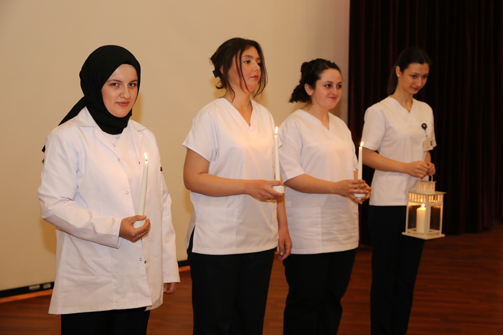 Törenin devamında, Hemşirelik Bölümüne en yüksek puan ile girmeye hak kazanan üç öğrenci; Mercan Günay, Büşra Okyay ve Binnur Korkmaz’a, 2021 – 2022 Eğitim Öğretim yılı Hemşirelik Bölümü dönem üçüncüsü Kübra Işık tarafından hemşirelik meşalesi aktarıldı.