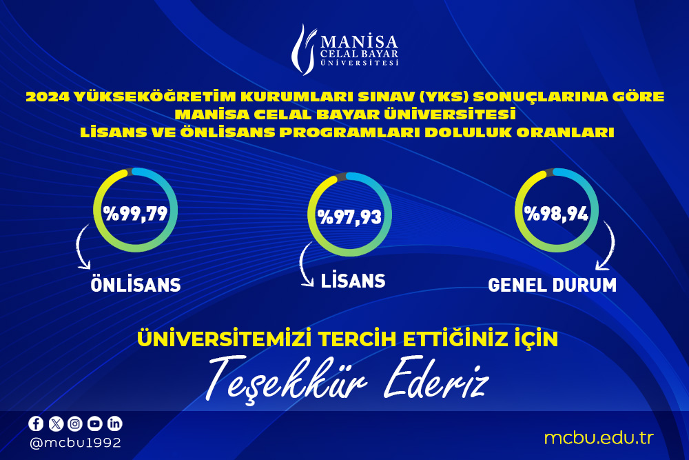 Based on the 2024 Higher Education Institutions Exam (YKS) results, Manisa Celal Bayar University has been granted the right to enroll 9,438 new students. Of these, 5,178 students are entitled to enroll in associate degree programs, while 4,260 students are allocated to undergraduate programs.
