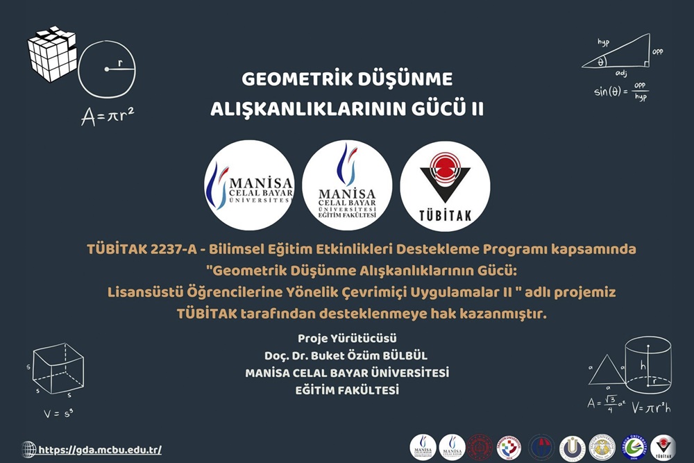 Manisa Celal Bayar University has been awarded support by TÜBİTAK for the project titled "The Power of Geometric Thinking Habits: Online Applications for Graduate Students II" under the TÜBİTAK 2237-A Scientific Education Activities Support Program.